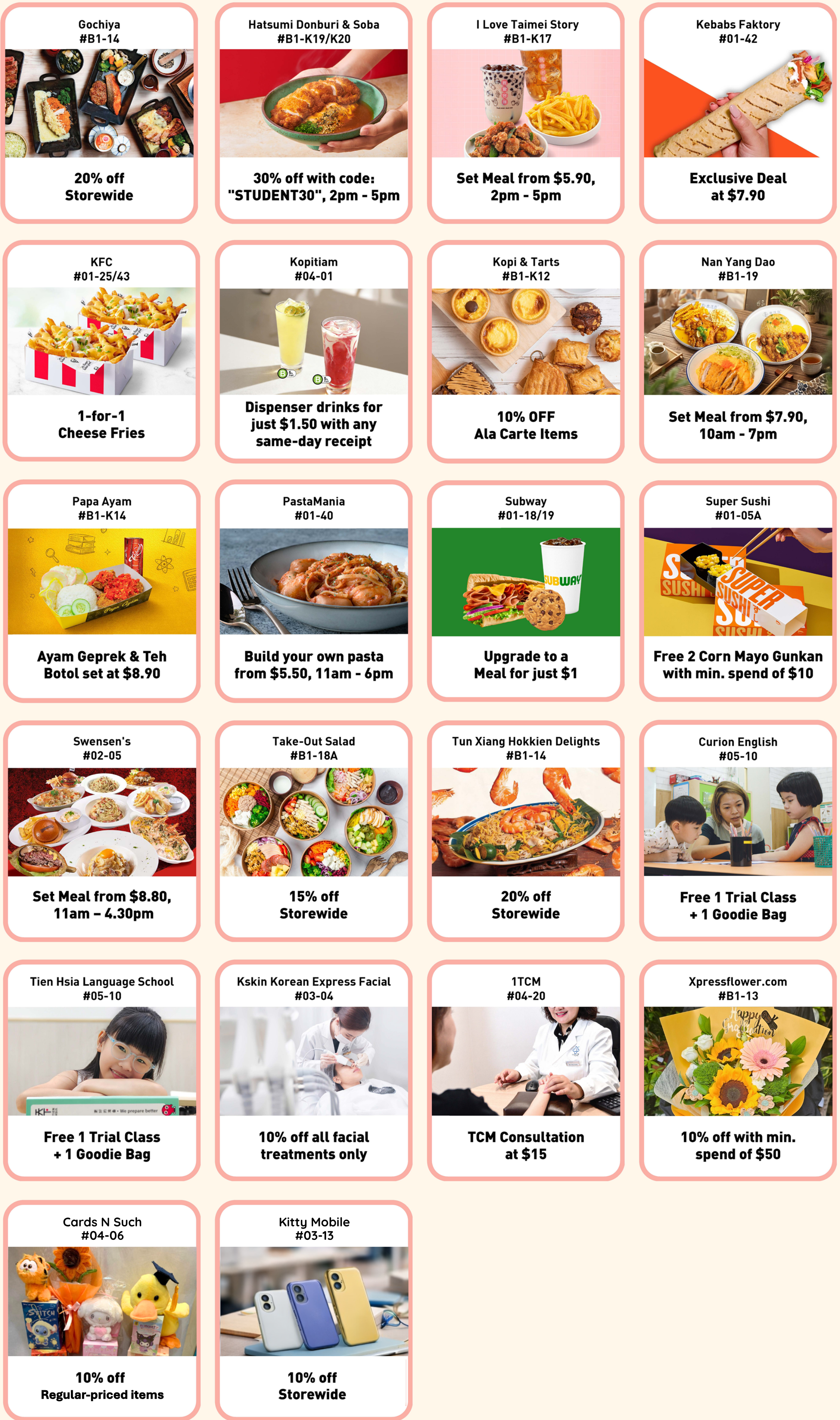 Terms and Conditions: Promotions are valid from 1 April – 31 December 2026, unless otherwise stated. Promotions are applicable for dine-in and/or takeaway on weekdays only (excluding Public Holidays), unless otherwise stated. Available at participating West Mall outlets on a first-come, first-served basis, while stocks last. Promotions cannot be used in conjunction with other offers, discounts, vouchers, and/or privileges. Prices are subject to prevailing GST and service charge (where applicable). A valid Student Pass must be presented in person at point of purchase. Promotion is open to full-time primary, secondary, polytechnic, and tertiary students. Promotional items are non-refundable, non-exchangeable and non-transferable, unless otherwise stated. Images are for illustration purposes only. Information is correct at time of publication. Management and participating stores reserve the right to amend or withdraw the promotion and its terms and conditions without prior notice. Please check in-store for details. Other terms and conditions may apply.