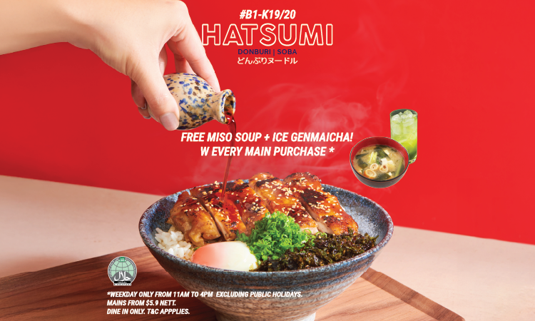Get FREE Miso Soup and Ice Genmaicha with any main order!Promotion is available for dine-in only, valid on weekdays between 11am and 4pm, excluding public holidays. Other terms and conditions apply; check in-store for more details.